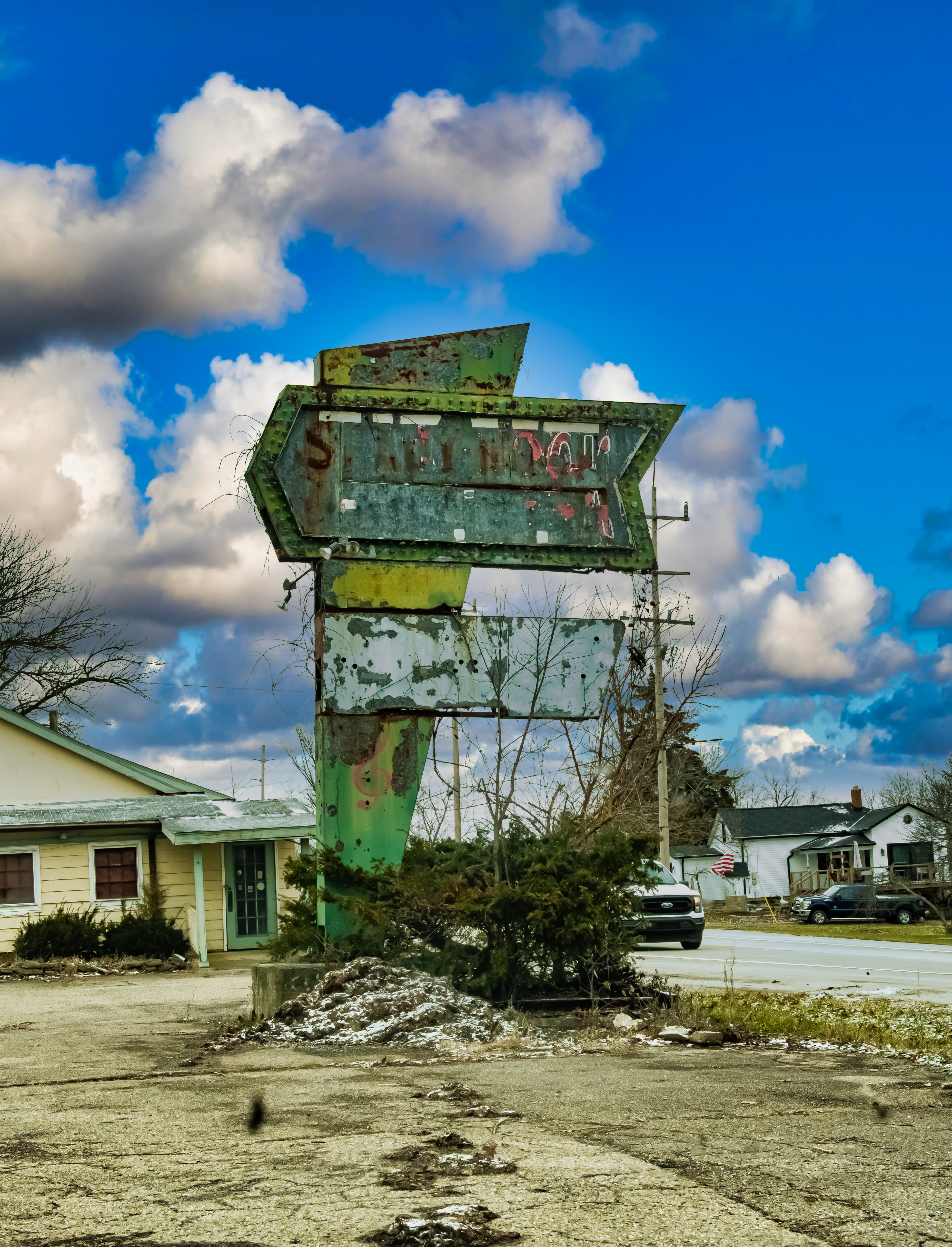 US 27 isn’t a road we take often. It runs out of Cincinnati’s northwestern suburbs up through Oxford—Toni’s not a fan of the town—then across the state line through West College Corner, Liberty, Decatur, and Richmond before we usually slide over to US 127 and head for Celina and Grand Lake. I’ve been passing this fading motel sign since family trips to Hueston Woods back in the ’60s. It’s been abandoned as long as I can remember; nobody seems interested in saving it. There are almost always a few semis parked nearby, never the same ones, never for long. The place itself doesn’t mean anything to me. It’s just the funky geometry of that decaying arrow by the roadside that keeps catching my eye.